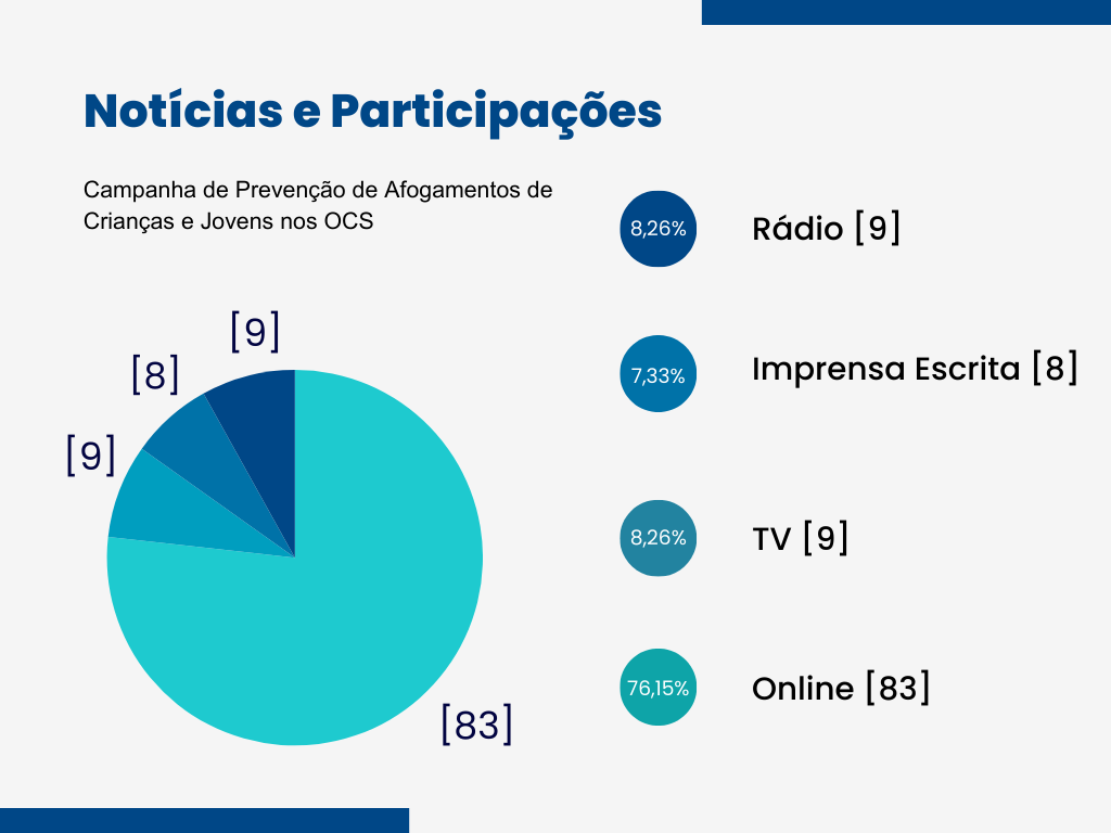 O tema voltou a merecer a atenção da Comunicação Social, sobretudo no dia de lançamento da Campanha e do Relatório da APSI, que analisa e atualiza os mais recentes números das fontes oficiais, e no Dia Mundial da Prevenção do Afogamento. Ao longo dos (quase) três meses de duração da Campanha houve 109 notícias e/ou participações que muito contribuíram para a sensibilização e informação de todos.